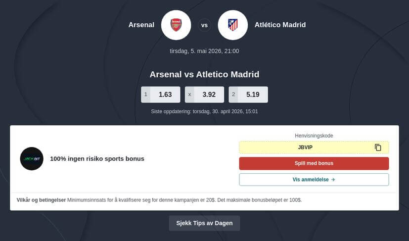 Les om Arsenal vs Atletico Madrid odds og spilltips i guiden vår. Denne Champions League semifinalen spilles i London på 5. mai 2026. Avspark blir kl. 21.00 norsk tid. Oddsene er 5,19 på Atletico, 1,62 på Arsenal og 3,92 på uavgjort.