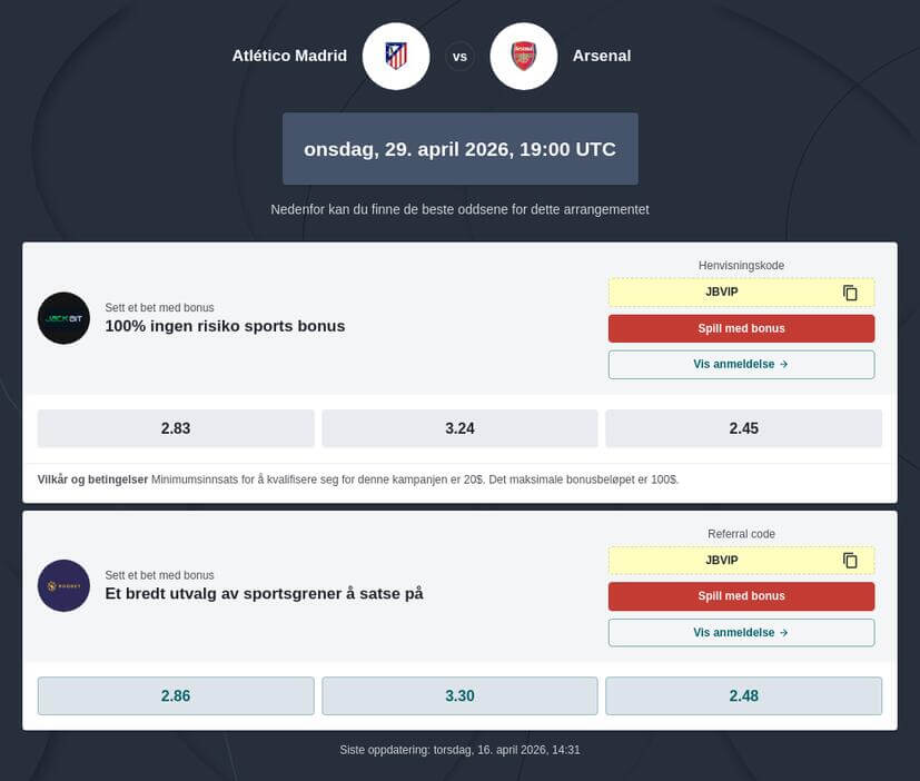 Beste odds på Atletico Madrid vs Arsenal finner du på 1xBit, Ivibet, Jackbit, 22bet og Roobet. Bruk bonuskoder som Jackbit bonuskode for å skaffe deg en fin velkomstbonus hos alle fem spillesteder. Finn ut mer om bonusene som tilbys til nye spillere ved å besøke nettsidene til hver av disse bookmakerne.
