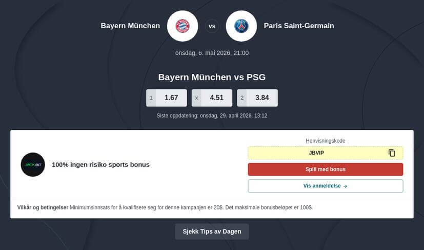 Stort sett alle online bookmakere tilbyr odds på denne kampen, men vi anbefaler 1xBit, Jackbit, Roobet, Ivibet og 22bet. Vi mener de er best for spillere som vil satse på våre Bayern München vs PSG odds og spilltips.