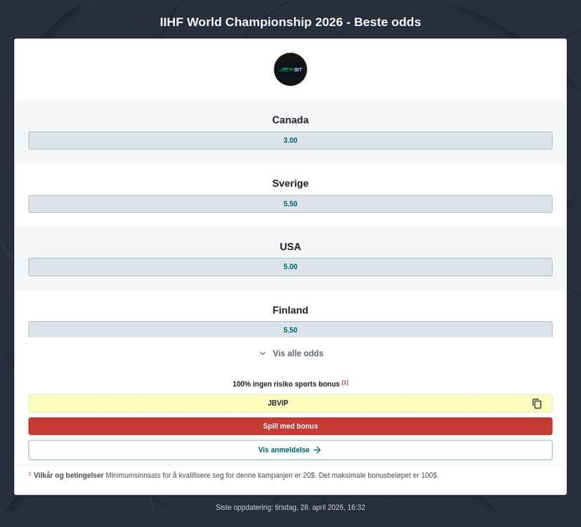 Jackbit, Roobet, 1xBit, 22bet og Ivibet tilbyr beste odds for spillere som vil vedde på ishockey-VM 2026 og de er fem spillesteder at vi anbefaler sterkt. Noe som er veldig bra med disse bookmakerne er at de tilbyr flotte og sjenerøse velkomstbonuser til nye spillere (f.eks. en Jackbit bonus). Disse bonusene kan du bruke for å satse på JohnnyBets tips. Du kan finne ut mer om alle de diverse bonusene og hva slags bonuskode du må bruke ved å lese våre detaljerte anmeldelser om de fem spillestedene.